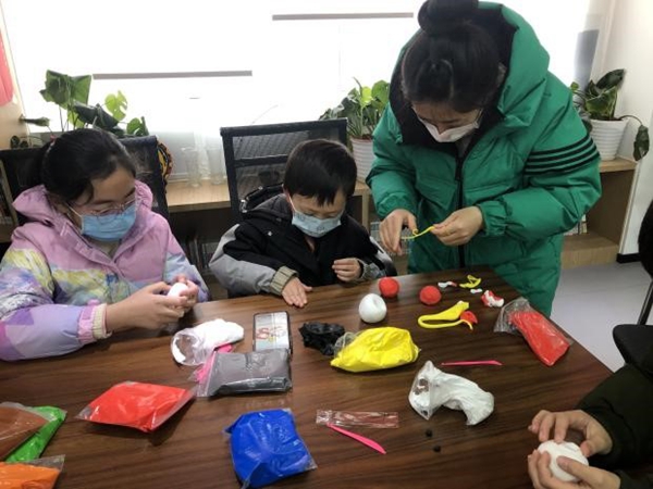 康怡社區(qū)黨員志愿者組織轄區(qū)青少年制作冬奧會(huì)吉祥物。溧經(jīng)開攝