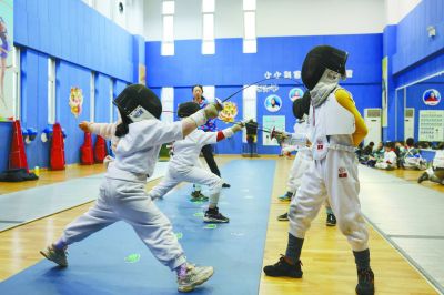 昨天,小學(xué)生在鼓樓區(qū)南財大附小參加擊劍社團活動。 南京日報/紫金山新聞記者 徐琦 攝