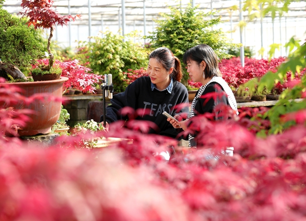 春節(jié)過后,三角梅也迎來銷售旺季,仲維國顯得更忙了。他是江蘇沭陽縣“資深”的返鄉(xiāng)創(chuàng)業(yè)者,如今在當?shù)仡伡?zhèn)堰下村“幸;ê!碧詫毷袌鰞(nèi)經(jīng)營著6座花木大棚,主要從事苗木和花卉盆景的電商銷售。