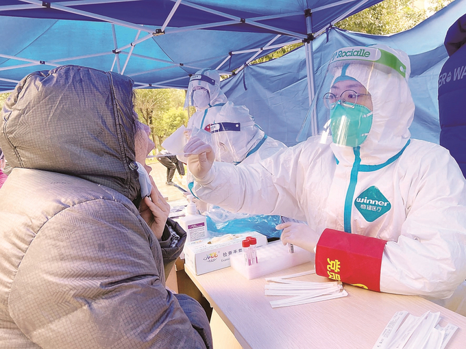 醫(yī)護(hù)人員在蘇州市吳中區(qū)陽光苑社區(qū)為居民進(jìn)行核酸采樣。迎煒 攝