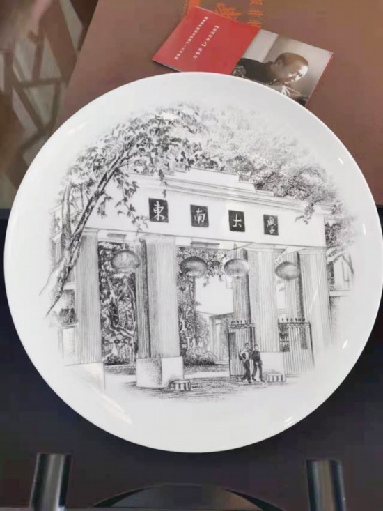 “瓷去經(jīng)年”實踐團(tuán)也定制了一件東大校門圖案的瓷刻小盤,古風(fēng)古韻的門樓被黑白釉面詮釋得淋漓盡致,一眼看去便能感受到東大校園所獨有的歷史底蘊(yùn)感。
