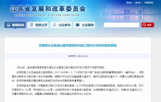 近日,從江蘇省發(fā)改委官網(wǎng)獲悉,無錫至太倉高速公路無錫至蘇州段工程可行性研究報告獲批復。