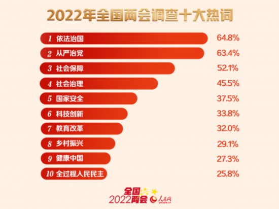 民之所盼,政之所向。2022年1月30日至2月25日,人民網(wǎng)開展第21次全國兩會調(diào)查,超過562萬人次參與。網(wǎng)友投票結(jié)果顯示,“依法治國”“從嚴治黨”“社會保障”三大熱詞關注度位居前三位,位列熱度第四位至第十位的熱詞分別是“社會治理”“國家安全”“科技創(chuàng)新”“教育改革”“鄉(xiāng)村振興”“健康中國”“全過程人民民主”。