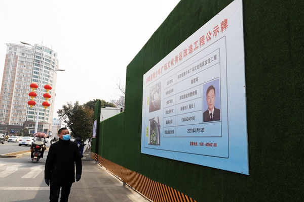 人民網(wǎng)宿遷2月28日電 初春時節(jié),在江蘇沭陽縣青少年廣場文化街區(qū)改造項目施工現(xiàn)場,挖掘機(jī)揮動著長臂忙著裝土,工程車來回穿梭運(yùn)土。廣場中間的建筑物內(nèi),機(jī)器轟鳴、敲擊聲此起彼伏,各工種正在如火如荼進(jìn)行施工。在沭陽青少年廣場的北大門外,懸掛的一塊公示牌引來行人紛紛駐足觀看。公示牌以表格的形式,公布了沭陽縣青少年廣場文化街區(qū)改造工程的改造前后圖片、分管縣領(lǐng)導(dǎo)、責(zé)任單位、項目負(fù)責(zé)人及照片、聯(lián)系電話、項目完成時限、監(jiān)督電話等相關(guān)信息。