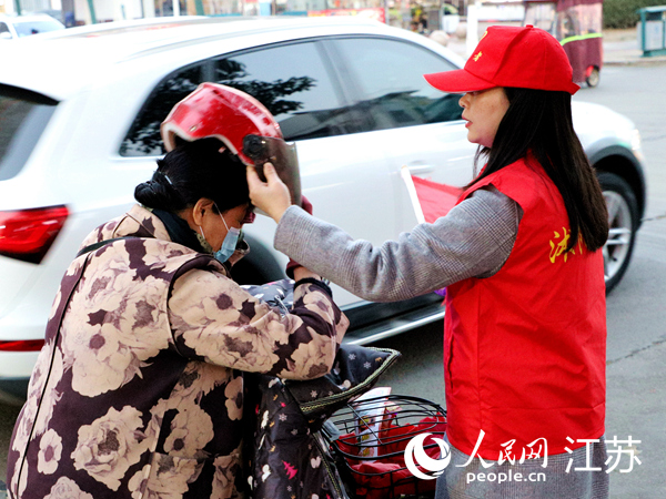 志愿者幫助市民帶好頭盔 宿遷煙草供圖