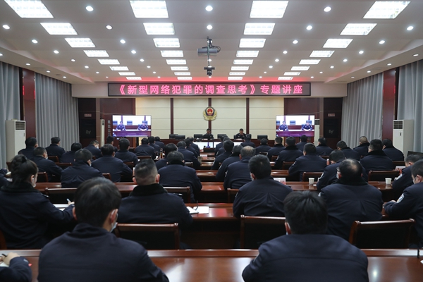 南京森林警察學(xué)院信息技術(shù)學(xué)院副院長吳育寶向民警授課講解《新型網(wǎng)絡(luò)犯罪的調(diào)查思考》。鹽城公安供圖
