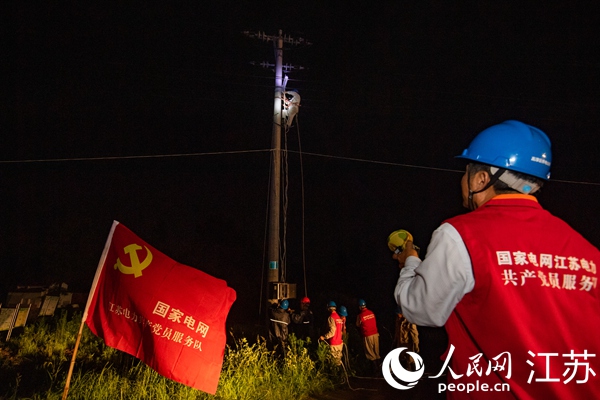 服務(wù)隊在磚墻鎮(zhèn)連夜搭設(shè)防汛照明線路。南京供電公司供圖
