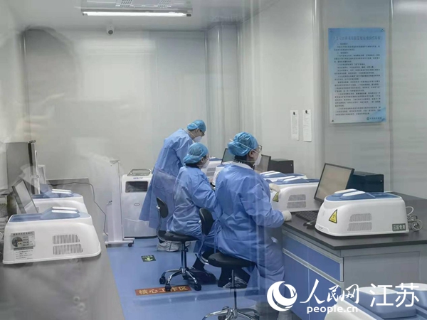 3月8日凌晨2時(shí)許,江蘇省東?h中醫(yī)院檢驗(yàn)科PCR實(shí)驗(yàn)室內(nèi)燈火通明,一名名檢驗(yàn)人員依舊“全副武裝”,有序地對(duì)新冠病毒核酸檢測(cè)樣本進(jìn)行檢測(cè)。