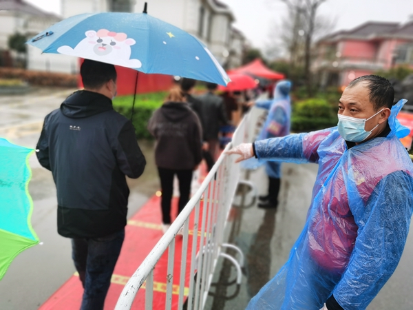 宿豫區(qū)煙草專(zhuān)賣(mài)局黨員志愿者吳長(zhǎng)松冒雨維護(hù)核酸檢測(cè)秩序,王嶺攝
