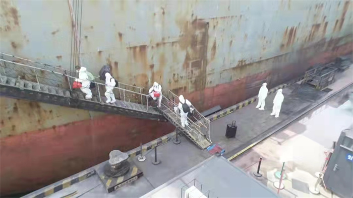 船員換班當(dāng)日,揚(yáng)州海事局工作人員提前至碼頭檢查疫情防控措施落實(shí)情況,督促碼頭從嚴(yán)從細(xì)落實(shí)各項疫情防控措施。接著,該局現(xiàn)場協(xié)助維護(hù)船員換班秩序,先下后上,做到不交叉、不接觸。與此同時,該局嚴(yán)格按照涉外疫情防控要求,做好進(jìn)入碼頭封控區(qū)域工作人員的個人防護(hù)措施。