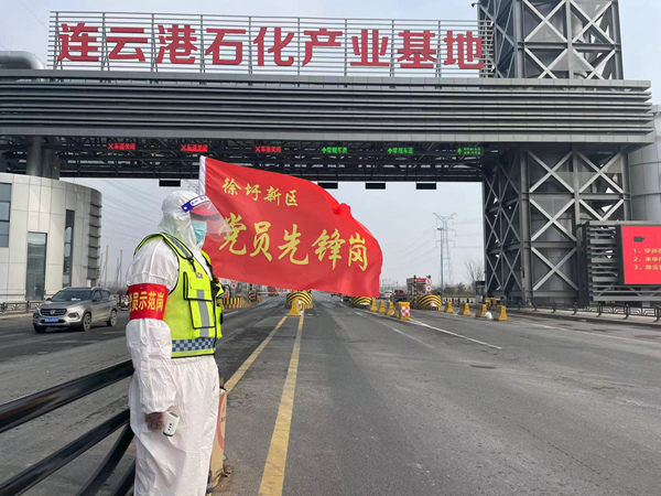 連云港石化產(chǎn)業(yè)基地入口,疫情防控志愿者正在執(zhí)勤。徐圩新區(qū)供圖