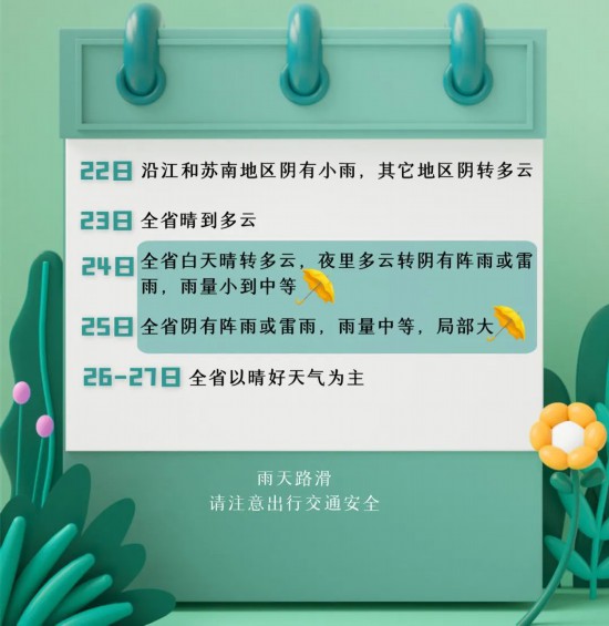 下一場雨出現(xiàn)在24日夜里,24日夜里-25日全省還有一次降水過程,本周具體天氣請見下圖。