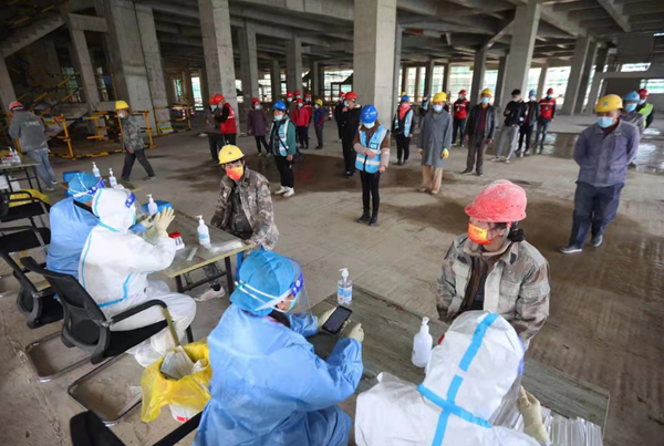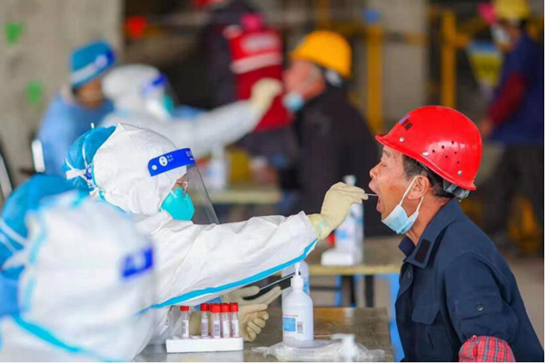 醫(yī)護(hù)人員為工人師傅做核酸檢測(cè)。建鄴建設(shè)局供圖