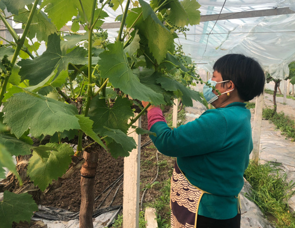 果農(nóng)正在葡萄大棚為葡萄綁蔓定梢。灌南縣委宣傳部供圖