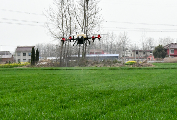 陽光下,兩只長了翅膀的“精靈”在麥田里飛舞。近日,在新集鎮(zhèn)孫灣村,兩架植保無人機正在“飛手”操控下噴灑農(nóng)藥。