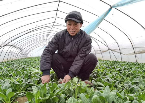 溫良根在自家的大棚里采摘青菜。灌南縣委宣傳部供圖