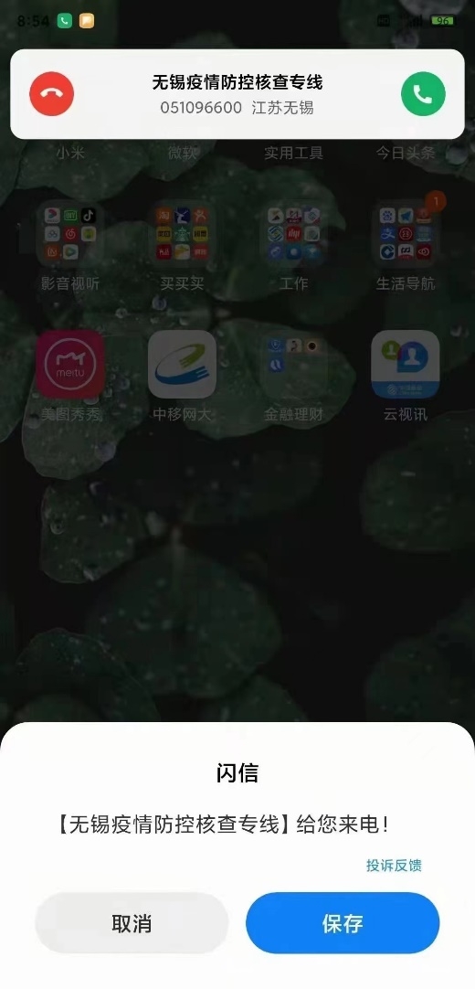 無錫疫情防控核查專線來電截圖。江蘇移動(dòng)供圖