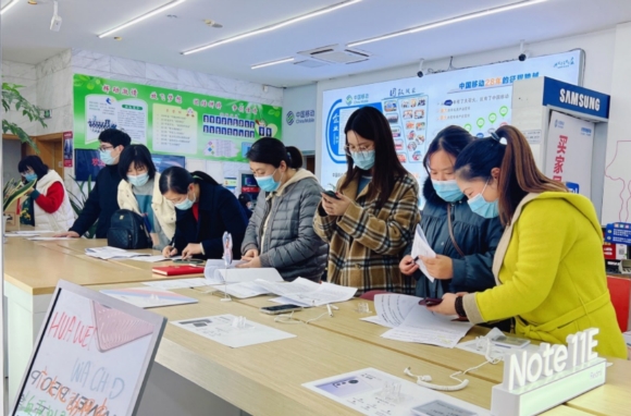 工作人員在營(yíng)業(yè)廳內(nèi)激活、測(cè)試防疫終端。江蘇移動(dòng)供圖