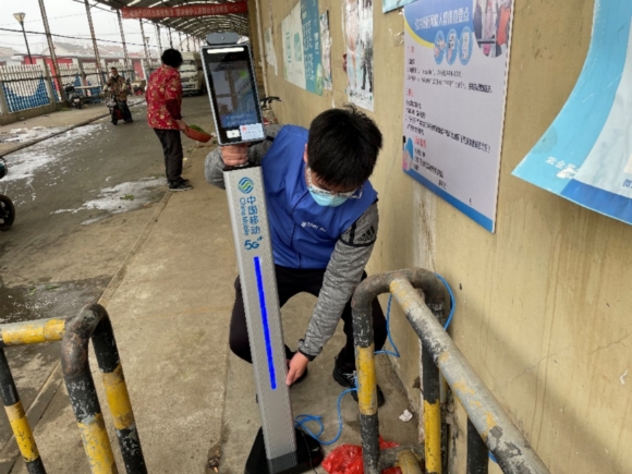 工作人員在丁溝農(nóng)貿(mào)市場(chǎng)安裝測(cè)溫閘機(jī)。江蘇移動(dòng)供圖