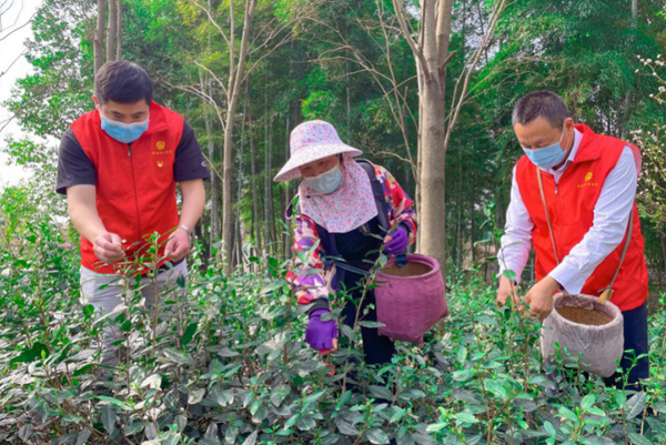 志愿者幫助茶農(nóng)采摘春茶。宜興煙草供圖
