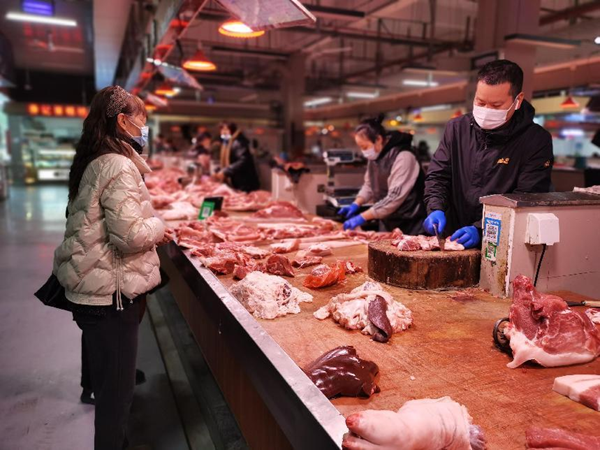 當(dāng)?shù)鼐用裾谫?gòu)買豬肉。王玉晴攝