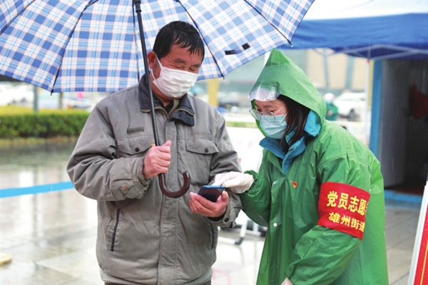 六合區(qū)雄州街道的黨員志愿者指導(dǎo)居民查看健康碼。六合區(qū)委宣傳部供圖
