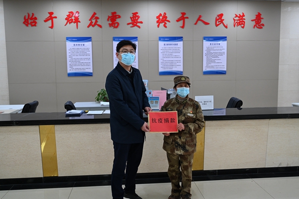 王仕花(右)捐款助力疫情防控。灌云臨港產(chǎn)業(yè)區(qū)供圖