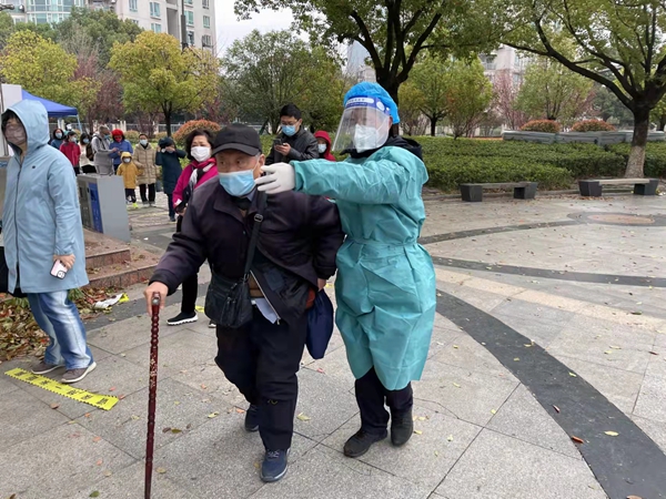 圖為“同心黨建聯(lián)盟”志愿者服務(wù)參加核酸檢測(cè)老人。江蘇省委統(tǒng)戰(zhàn)部供圖