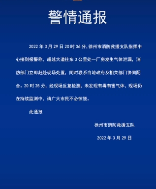 徐州市消防救援支隊(duì)在當(dāng)晚24時(shí)左右發(fā)布的警情通報(bào)中表示,3月29日20時(shí)06分,徐州市消防救援支隊(duì)指揮中心接到報(bào)警稱,超越大道往東3公里處一廠房發(fā)生氣體泄露,消防部門立即趕赴現(xiàn)場處置,同時(shí)聯(lián)系當(dāng)?shù)卣跋嚓P(guān)部門協(xié)同配合。20時(shí)25分,經(jīng)現(xiàn)場反復(fù)檢測,未發(fā)現(xiàn)有毒有害氣體,現(xiàn)場仍在持續(xù)監(jiān)測中。