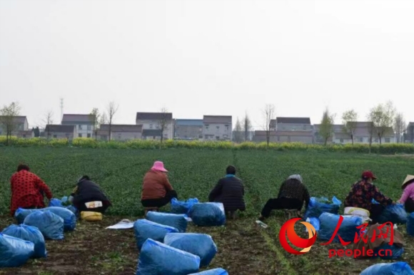 村民及志愿者正在采摘菠菜。朱陳博攝