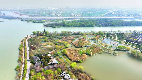 春回大地,大運河七河八島沿岸桃紅柳綠,色彩斑斕?罩续B瞰運河沿岸,船只川流不息,兩岸濕地景觀,村莊與運河相依,生機勃勃,如同一幅春的畫卷。 嚴(yán)柏平 程曦 攝