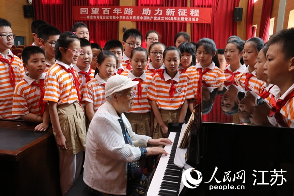 2021年迎建黨百年時(shí),丁芝秀老人帶領(lǐng)少先隊(duì)員唱《盧志英中隊(duì)之歌》。雨花臺(tái)區(qū)實(shí)驗(yàn)小學(xué)供圖