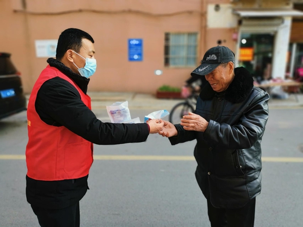 圖為志愿者為社區(qū)老年居民發(fā)放口罩。建湖煙草供圖