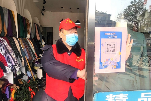 圖為志愿者為社區(qū)沿街商戶張貼場所碼。建湖煙草供圖