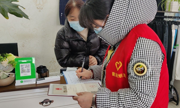 圖為志愿者入戶登記社區(qū)商戶信息。建湖煙草供圖