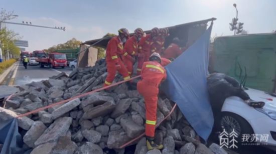 南通一卸貨車(chē)側(cè)翻掩埋兩人 消防員徒手扒石塊救援