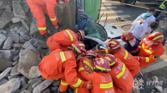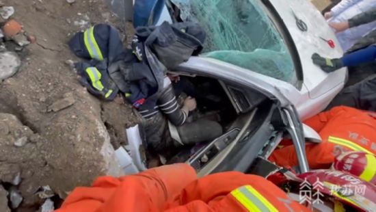 經(jīng)過(guò)十分鐘人力搬運(yùn),上方石塊清理完畢后,消防救援人員立即對(duì)副駕駛車(chē)門(mén)進(jìn)行破拆。在消防救援人員的通力協(xié)作下,副駕駛室內(nèi)的被困人員被成功救出并移送至救護(hù)車(chē)。