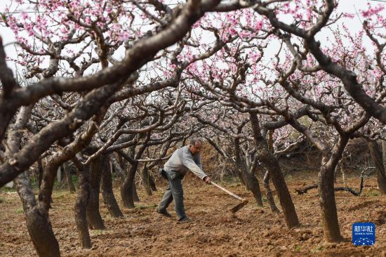 4月5日,山東省青州市王府街道角樓村農(nóng)民在桃園里勞作。