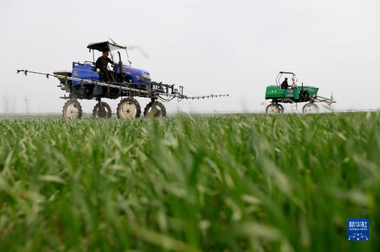 4月5日,山東省青島市即墨區(qū)段泊嵐鎮(zhèn)劉家營里村的農(nóng)民使用自走式高桿噴霧機(jī)在麥田里噴灑葉面肥。