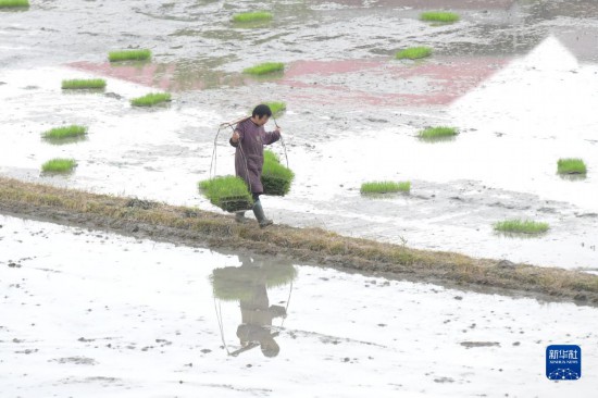4月5日,在湖南省婁底市雙峰縣井字鎮(zhèn)花橋村,農民挑著秧苗走在田埂上。
