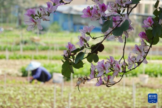 4月5日,在廣西南寧市西鄉(xiāng)塘區(qū)石埠街道下靈村蔬菜種植基地,農(nóng)民在田間勞作。