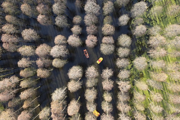 清明假期,市民在淥洋湖濕地公園水上森林乘船游覽。孟德龍 攝