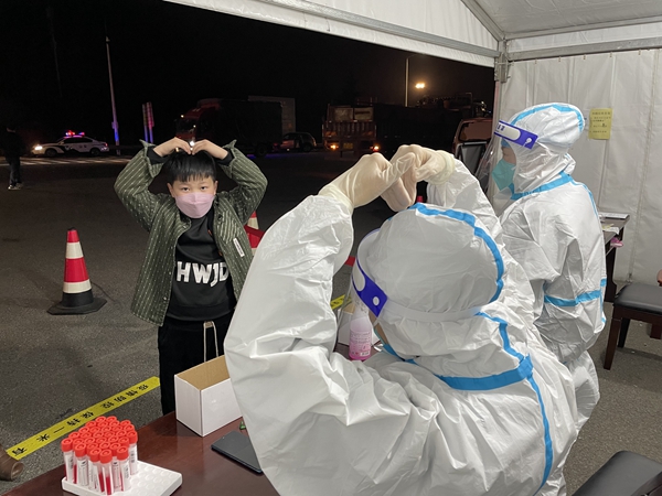3月29日晚,一位小朋友在G25長(zhǎng)深高速宜興卡口完成采樣后對(duì)“大白”比心。吳夢(mèng)嬌攝