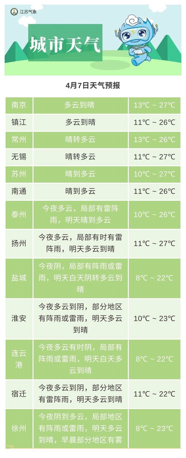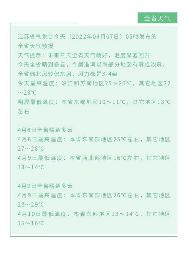 據(jù)江蘇省氣象臺(tái),今天(7日)全省晴到多云,今晨淮河以南部分地區(qū)有霧或濃霧。全省偏北風(fēng)轉(zhuǎn)偏東風(fēng),風(fēng)力都是3-4級(jí),今天最高溫度:沿江和蘇南地區(qū)25~26℃,其它地區(qū)22~23℃,明晨最低溫度:本省東部地區(qū)10~11℃,其它地區(qū)13℃左右。