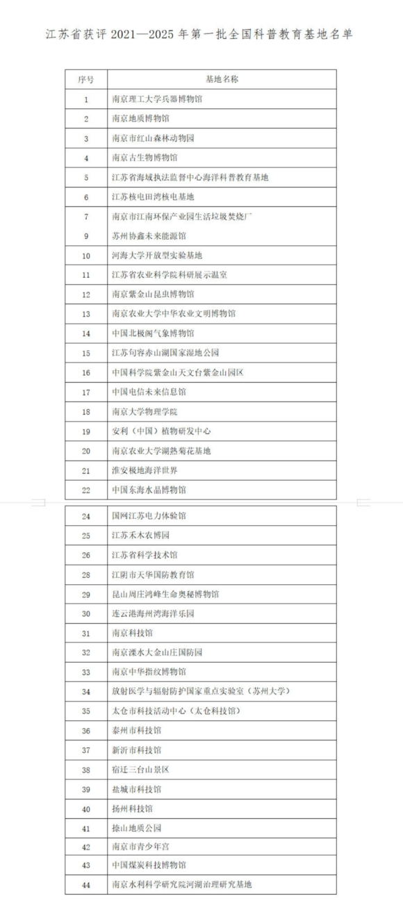 近日,中國科協(xié)發(fā)布“2021—2025年第一批全國科普教育基地”名單,全國800家單位上榜,江蘇有44家單位入選,數(shù)量位列全國第三。