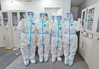 4月8日晚,隨著海南省援滬醫(yī)療隊近百名醫(yī)護人員的進駐,上海嘉定南翔方艙醫(yī)院正式投入運行。圖為醫(yī)護人員在入艙前加油鼓勁。新華社記者 李 賀攝