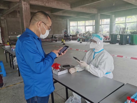 “請出示您的的采樣碼,謝謝……”在崇川區(qū)文峰街道鳳凰社區(qū),遠遠就看到了南通煙草城區(qū)黨支部書記顧成鵬的身影,此時的他在核酸檢測的崗位上忙碌著。他率先出征防疫一線,掃描、錄入信息、輸入電話號碼,手指不停地在屏幕上快速點擊著!昂怂釞z測信息登記工作非常重要,半天要掃描近400個采樣碼,工作量雖然大,但不能出一點差錯!鳖櫝声i說。從烈日炎炎到日落下山,他仍在配合社區(qū)做著送物資、撤臺子、做消殺等工作。