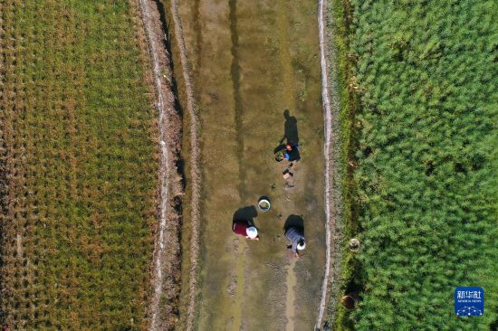 4月11日,在重慶市黔江區(qū)馬喇鎮(zhèn)蓮花社區(qū),村民在田間忙碌(無人機照片)。