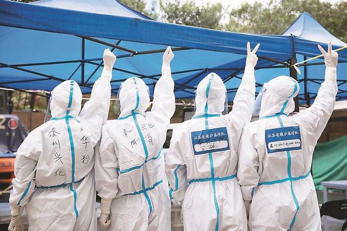13日,在上海市廣福居民區(qū)一處采樣點,來自江蘇的援滬醫(yī)生在采樣結(jié)束后合影,為上海加油。新華社記者 金立旺 攝