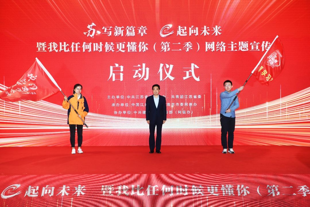 啟動(dòng)儀式上,江蘇省委常委、宣傳部部長(zhǎng)張愛(ài)軍,省委宣傳部常務(wù)副部長(zhǎng)、省新聞出版局(省版權(quán)局)局長(zhǎng)、省電影局局長(zhǎng)梁勇,省委網(wǎng)信辦主任兼省委宣傳部副部長(zhǎng)徐纓,共青團(tuán)江蘇省委書(shū)記司勇,新華日?qǐng)?bào)社黨委書(shū)記、社長(zhǎng)、新華報(bào)業(yè)傳媒集團(tuán)董事長(zhǎng)雙傳學(xué),省廣電總臺(tái)(集團(tuán))黨委書(shū)記、臺(tái)長(zhǎng)、董事長(zhǎng)卜宇,鳳凰出版?zhèn)髅郊瘓F(tuán)黨委書(shū)記、董事長(zhǎng)孫真福,南京市委常委、宣傳部部長(zhǎng)陳勇共同啟動(dòng)“蘇寫(xiě)新篇章 E起向未來(lái)” 暨“我比任何時(shí)候更懂你”(第二季)網(wǎng)絡(luò)主題宣傳活動(dòng)。